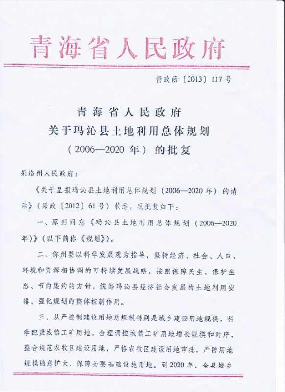 关于玛沁县土地利用总体规划(2006-2020年)的批复